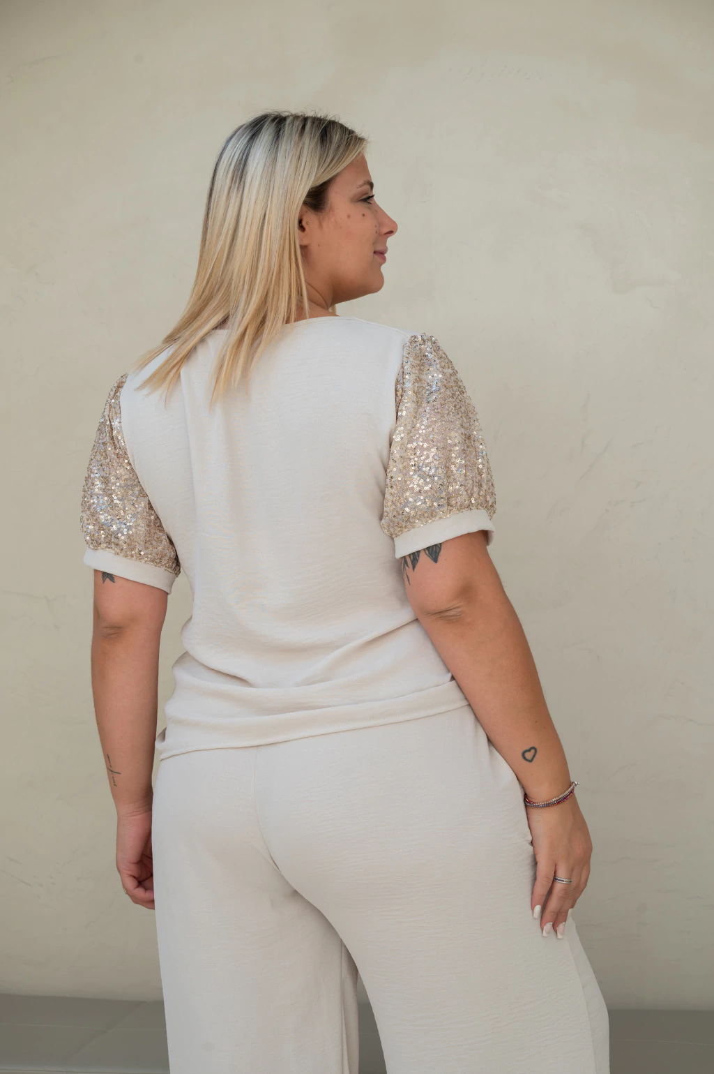 La Blusa Furia es una prenda elegante con escote corazón y manga corta de lentejuelas. El puño le da un detalle especial que realza su diseño.