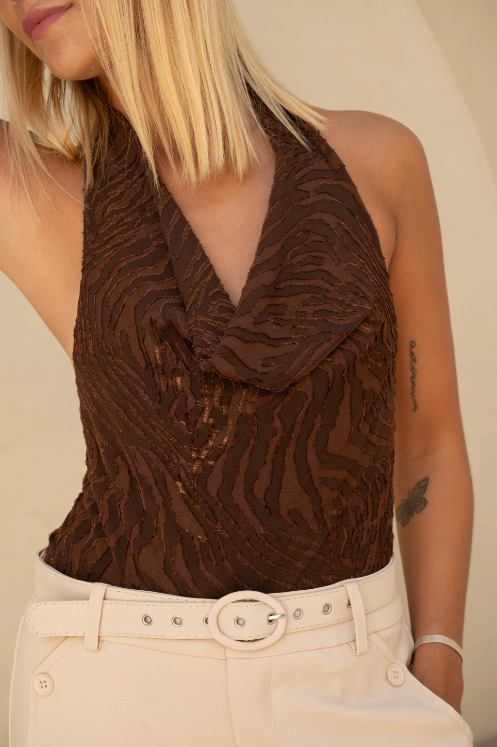 Confeccionado en lycra, este body sin mangas destaca por su textura labrada que aporta un toque de distinción. Su bretel se ata en el cuello, permitiendo un ajuste cómodo y personalizado.