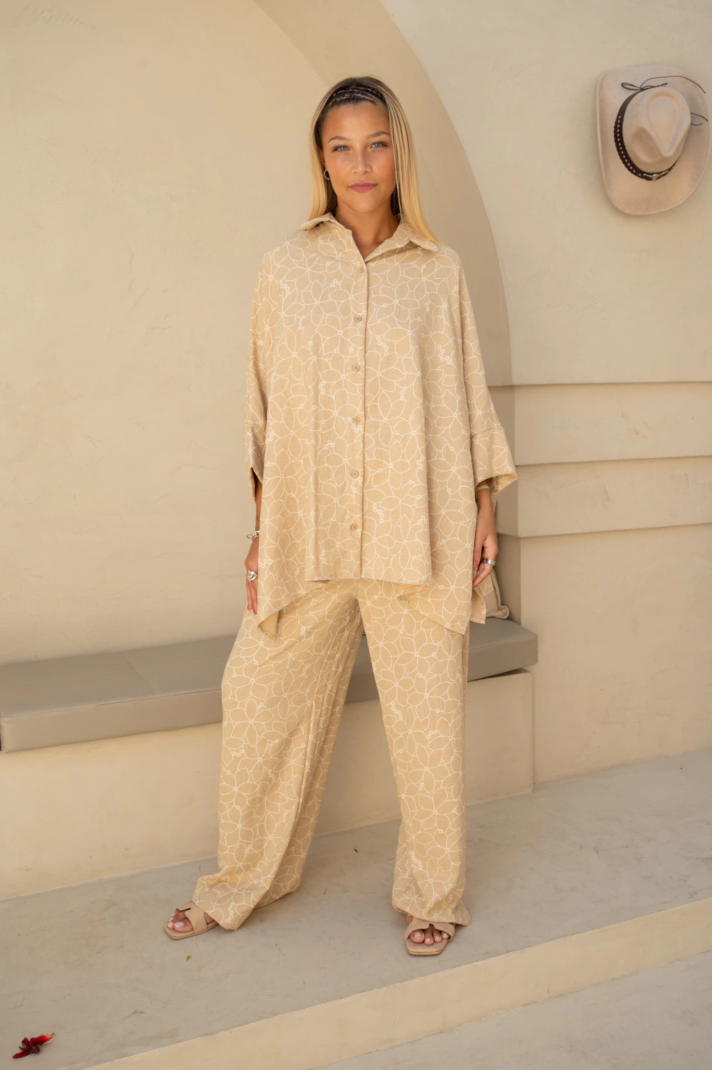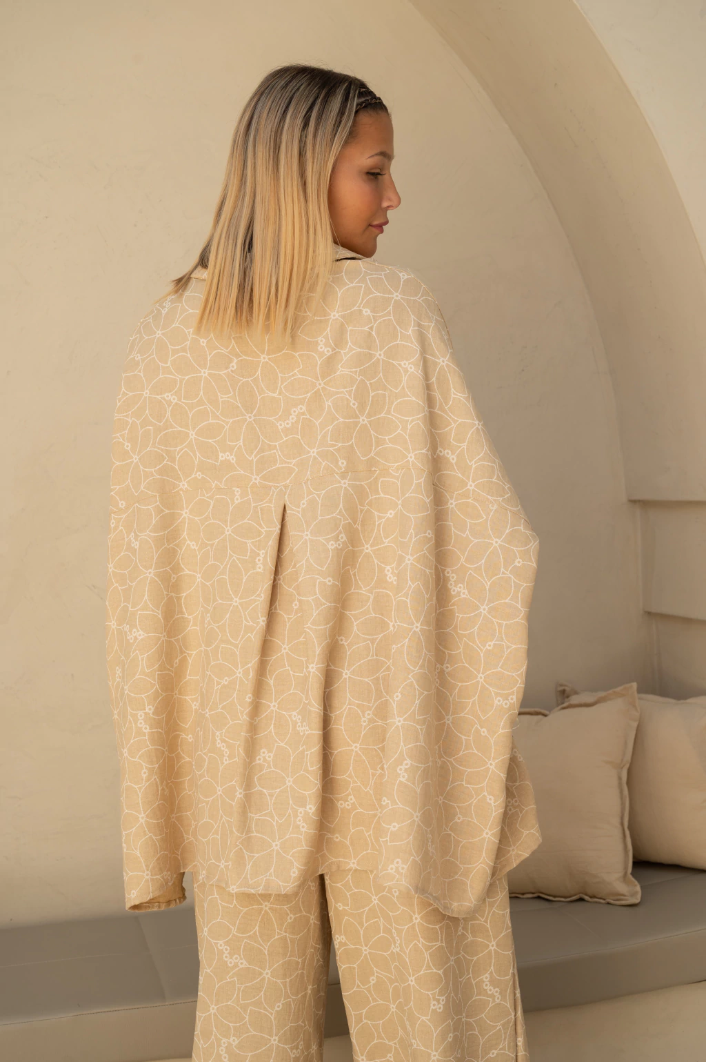 Camisa de lino con manga corta y bordados florales que aportan un toque delicado y fresco. Cuenta con tajos a los costados para mayor comodidad y libertad de movimiento.