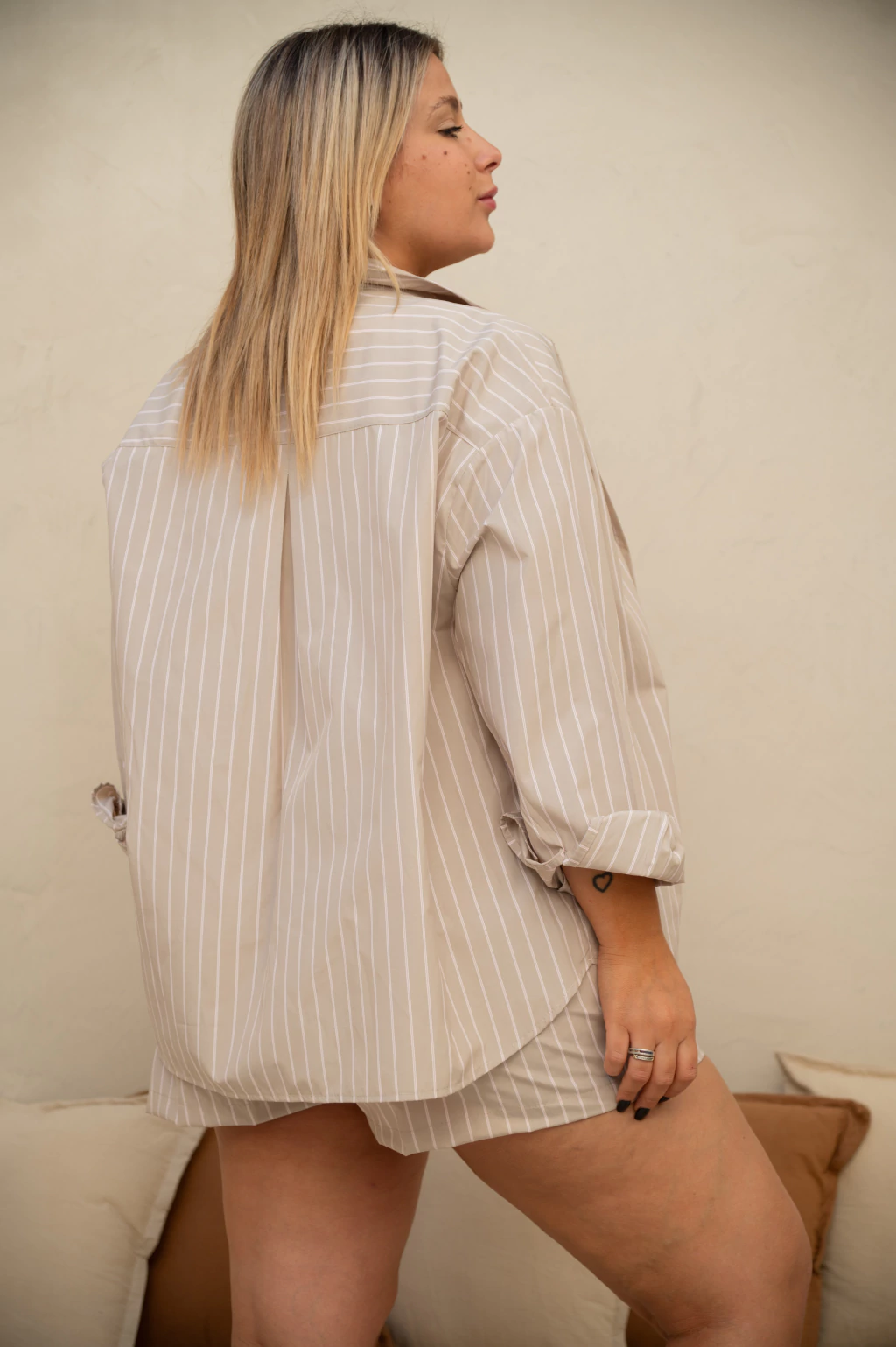Confeccionada en tela poplin de alta calidad, su diseño rayado y manga larga aportan un estilo clásico y versátil, ideal para cualquier ocasión. Su tejido ligero y resistente garantiza comodidad durante todo el día. La Camisa Encuentro hace conjunto perfecto con el Short Consuelo, para un look completo.