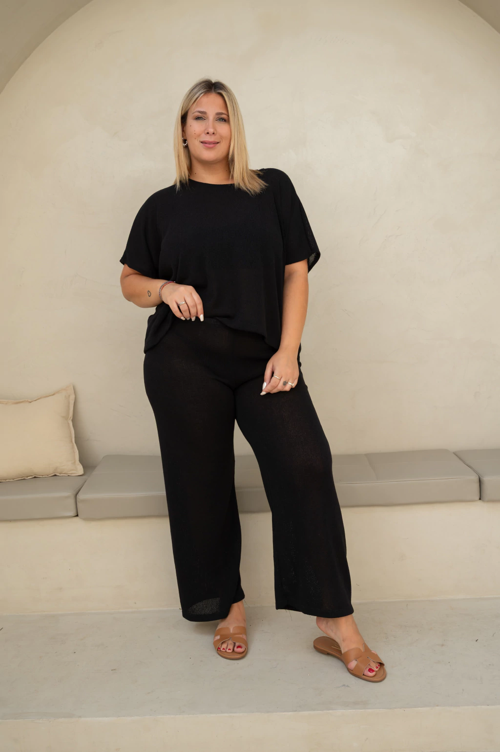 Descubrí el conjunto de hilo tejido, ideal para tu comodidad diaria. El pantalón con cintura elástica se adapta perfectamente a tu cuerpo, brindando libertad de movimiento. La remera de manga corta completa el conjunto con un diseño sencillo y fresco.