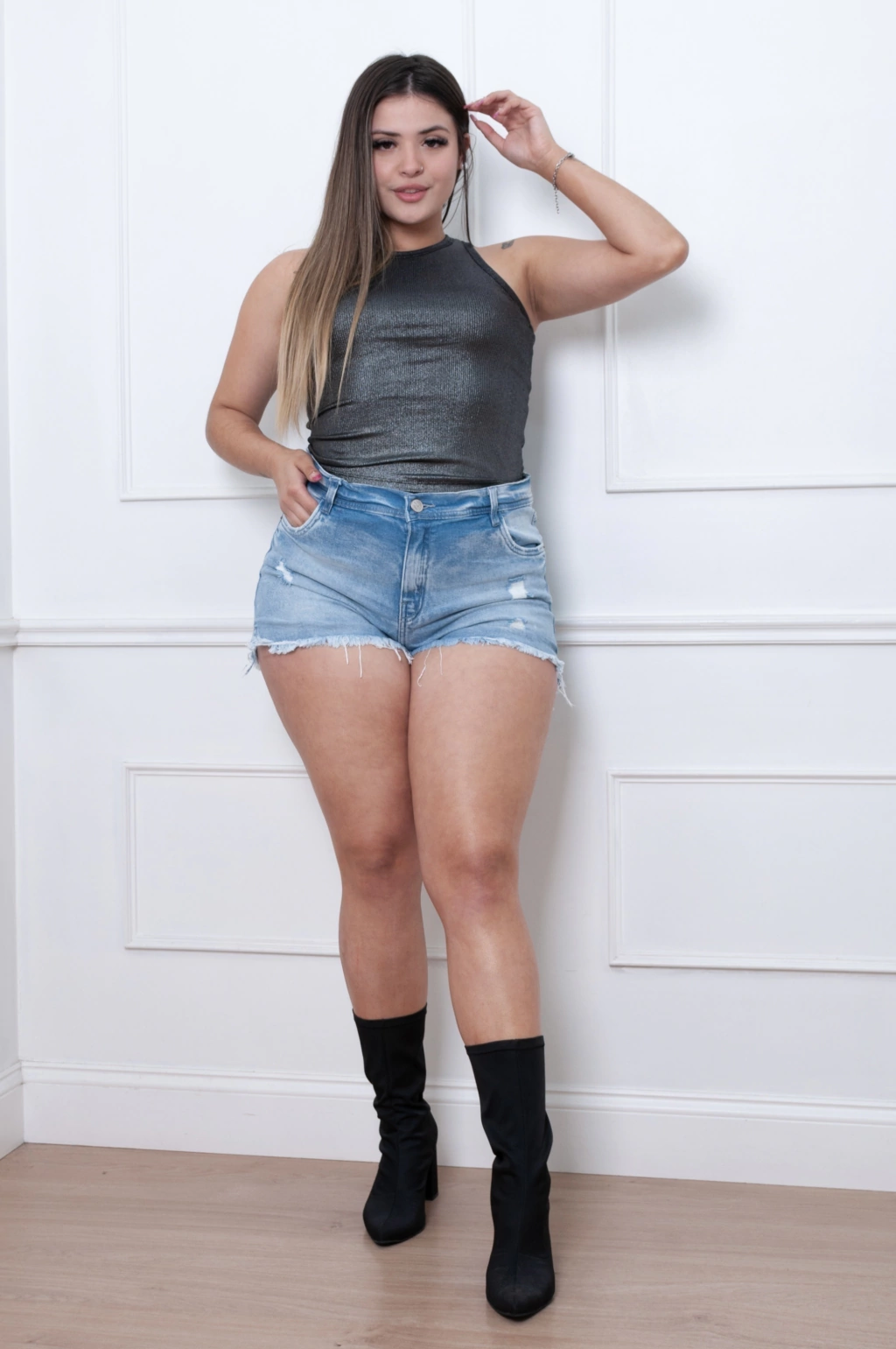 Este short de jean elastizado es la prenda ideal para lucir un estilo casual y moderno con comodidad. Cuenta con pequeñas roturas estratégicas, un deflecado en pierna y un tajito lateral que le aportan un toque de tendencia y frescura.